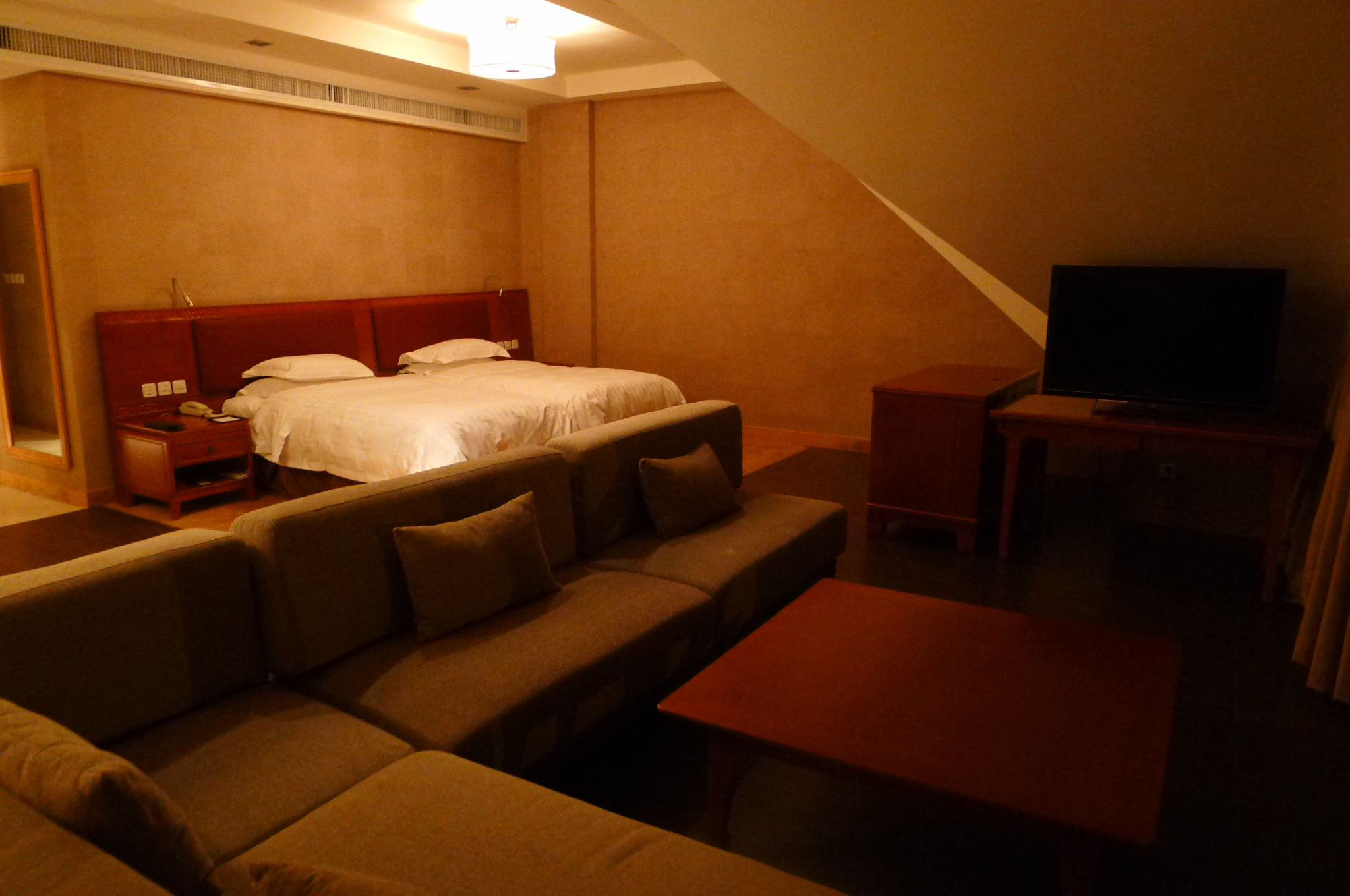 펜트하우스 스위트. 벽에는 대형TV가 달려 있고 1층에는 PC가 설치되어 있습니다.