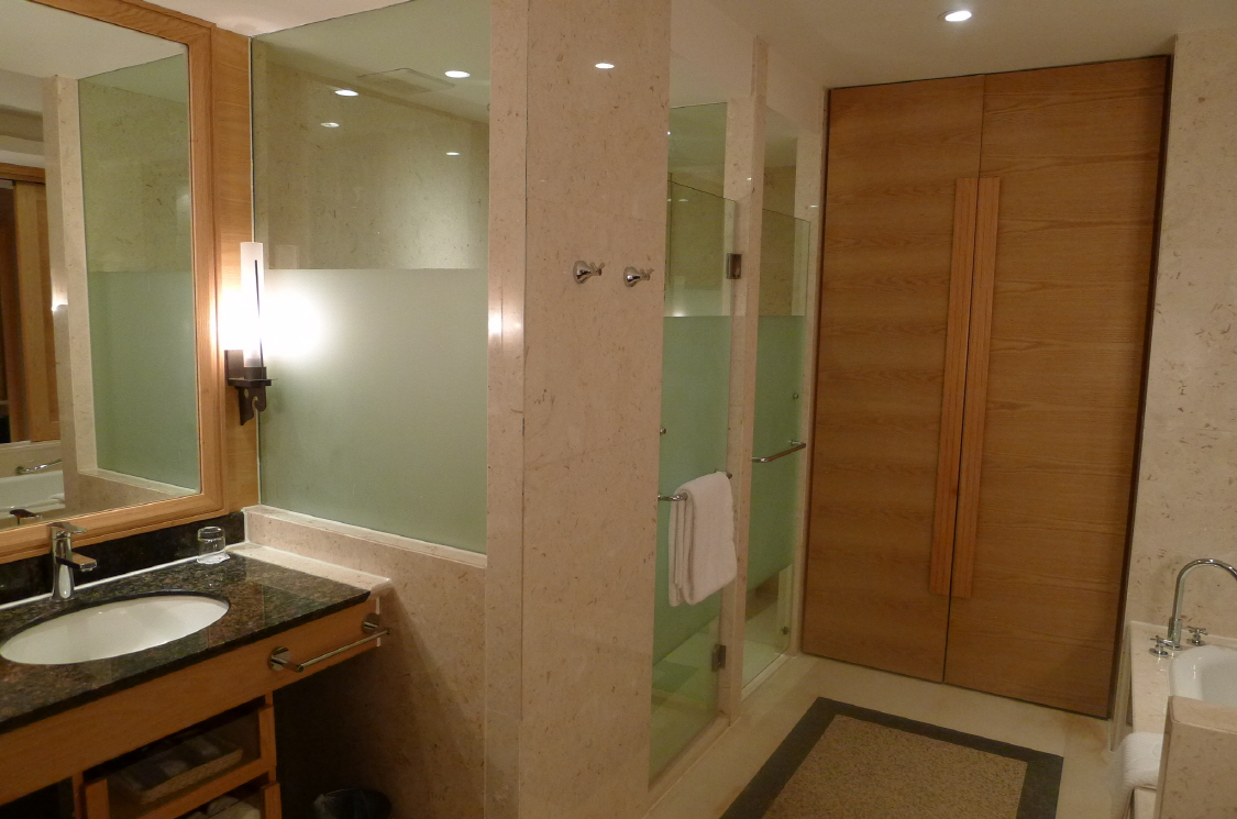 디럭스 클럽룸. 욕실은 샤워 부스와 욕조가 분리되어 있습니다. 두개의 유리문중 왼쪽은 샤워